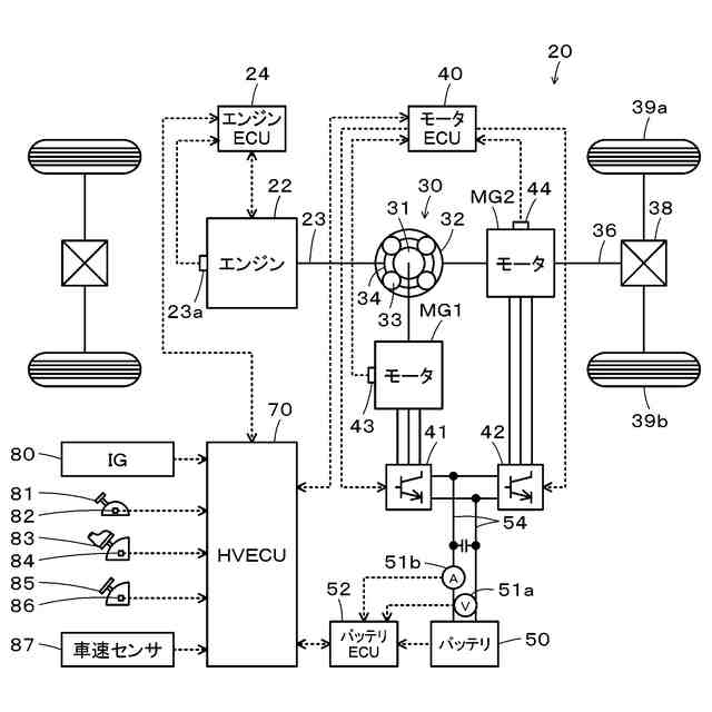 次に、本開示を実施するための形態について説明する。図1は、本実施形態のハイブリッド車20の概略構成図であり、図2は、モータMG1,MG2を含む電気駆動系の概略構成図である。本実施形態のハイブリッド車20は、図1に示すように、エンジン22と、プラネタリギヤ30と、モータMG1,MG2と、インバータ41,42と、バッテリ50と、ハイブリッド用電子制御ユニット(以下、HVECUという)70とを備える。