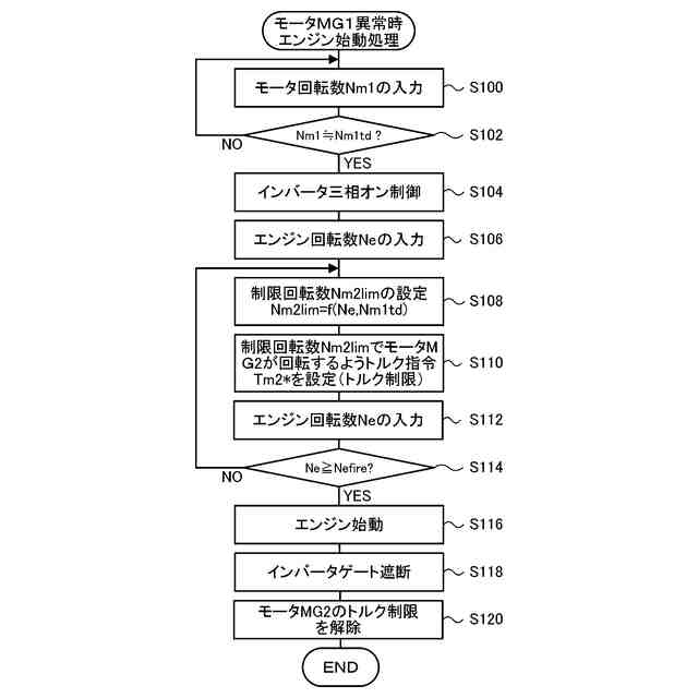 モータMG1異常時エンジン始動処理の一例を示すフローチャートである。