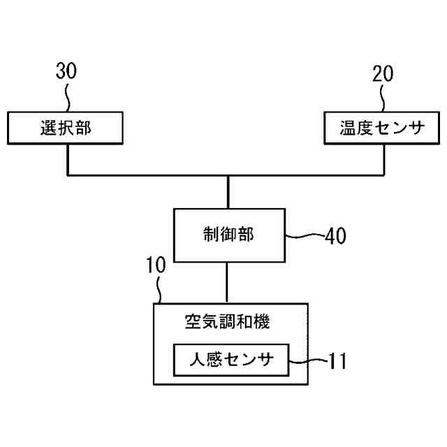 前記選択手段によって前記第1モードが選択された場合には前記人検知手段の検知結果に応じて前記空気調和機の動作を制御し、前記選択手段によって前記第2モードが選択された場合には前記温度情報取得手段によって取得した温度情報に応じて前記空気調和機の動作を制御する制御手段と、