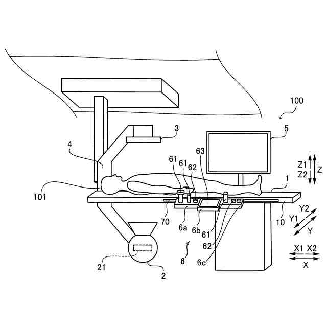 上記特許文献1には、被検者を載置する移動可能な天板と、天板の側面に設けられた操作部と、天板が移動した場合に操作部の位置を移動させる移動機構と、を備えるX線撮影装置が開示されている。上記移動機構は、天板が傾斜した場合に、操作部を、天板が傾斜した方向の反対方向に、天板が傾斜した角度分傾斜させる。すなわち、上記移動機構は、天板がチルト動作をした場合に、天板の傾斜に伴って変化した操作部の傾斜角度を、チルト動作前の傾斜角度(水平)に戻す。