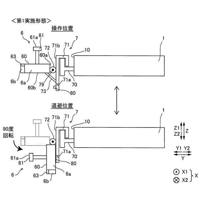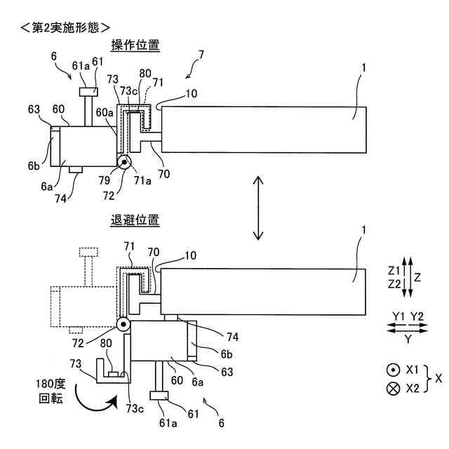 上記一の局面におけるX線撮影装置では、操作部は、操作位置と、操作部の天板の側面からの突出長さが操作位置における突出長さよりも相対的に小さい退避位置とに移動可能なように構成されている。これにより、術者が天板上に乗り出すことにより被検者に近づいて施術を行う場合などに、操作位置に位置する操作部を突出長さが操作位置における突出長さよりも相対的に小さい退避位置に移動させることができる。退避位置における操作部の突出長さは操作位置における突出長さよりも相対的に小さいため、退避位置における操作部のほうが、操作位置における操作部よりも術者の腹部などと干渉しにくい。そのため、施術中において、退避位置に位置する操作部のほうが、操作位置に位置する操作部よりも、術者の腹部などと干渉するのを抑制することができる。その結果、操作部が施術の支障となるのを抑制することができる。
