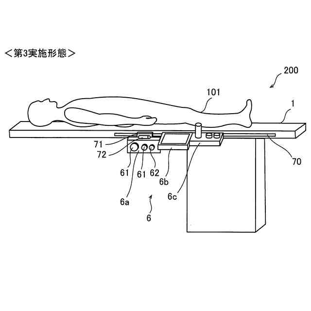 上記特許文献1に記載されたX線撮影装置において、操作部は、天板の長手方向の側面から突出するように設けられている。術者は、X線撮影装置を用いた施術の際、操作部が設けられた天板の長手方向の側面側に立って、操作部を操作するとともに施術を行う。しかしながら、上記特許文献1に記載されたX線撮影装置では、術者が天板上に乗り出すことにより被検者に近づいて施術を行う場合に、操作部は天板の側面から突出しているため、操作部と術者の腹部などとが干渉する可能性がある。そのため、操作部が施術の支障となるという問題がある。よって、操作部が施術の支障となるのを抑制することが望まれている。