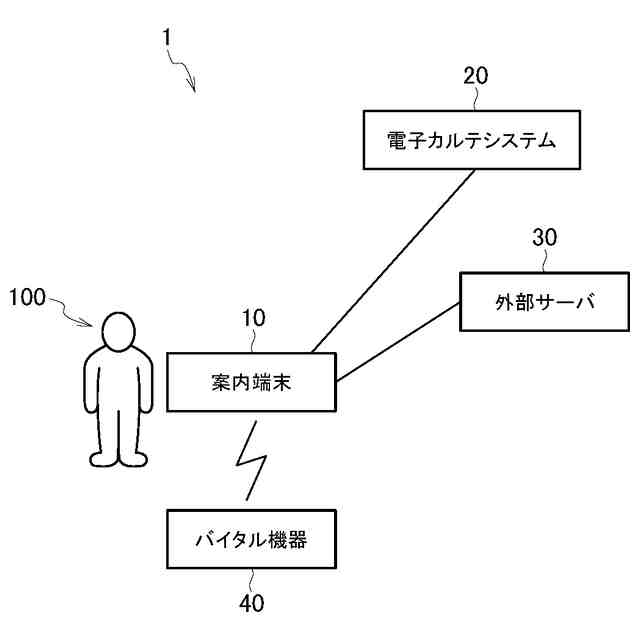 【解決手段】一実施形態に係る案内端末10は、各種情報を記憶する記憶部11と、近距離無線通信により外部メディアから情報を読み取る読取部12と、電子カルテシステムと情報通信する通信部13と、通信部の動作を制御する制御部14とを備え、制御部14は、読取部12から患者のバイタルに関する情報を取得し、記憶部11において患者を一意に識別する識別情報が記憶されている場合、通信部13を介して患者のバイタルに関する情報を電子カルテシステム20に送信する。