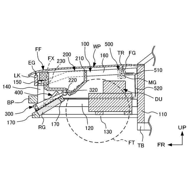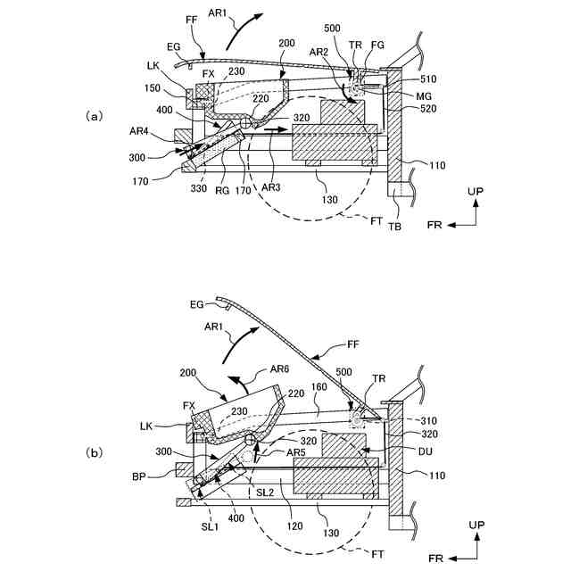 【解決手段】車幅方向を向いた開閉軸TRが設けられているフロントフード部FFと、車両上部前側におけるフロントエンドクロスメンバ150と、車両下部前側から車両上部後側に向かう傾斜SL1および傾斜SL2を成し、車両下部前側には空気を取り込む吸入口AIを有し、車幅方向に向かって延在している導風ガイドクロスメンバ320が設けられている導風ガイド部300と、車両下側面が導風ガイドクロスメンバ320と回動可能に係合しているフロントトランク部200と、導風ガイド部300を摺動可能に係合させているスライド部400と、導風ガイド部300とフロントフード部FFとを連動可能に連結させているフロントフード連結部500と、を備えている。