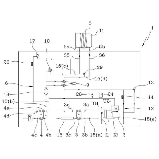 - 前記第1の熱交換器(4)の前記熱交換流体用の前記出口(4b)から前記第2の熱交換器(5)の入口(5a)まで延びる、前記熱交換流体用の入口ブランチ(35)と、