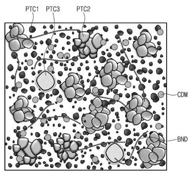 前記第1粒子は炭素を含む第1コーティング層を含み、