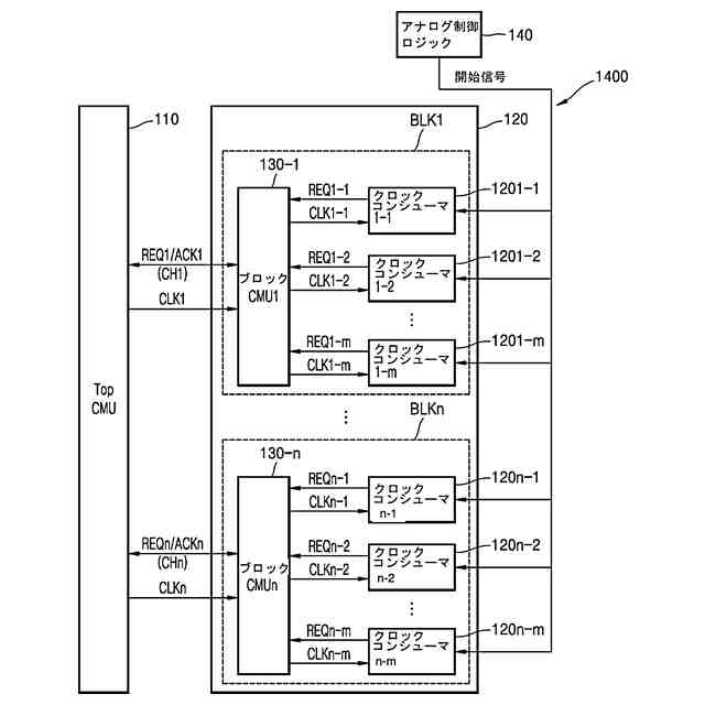 【解決手段】複数のクロックコンシューマ(CC)と複数のブロッククロック管理ユニット(BCMU)、及びトップクロック管理ユニット(TCMU)を含み、各BCMUがCCの内の少なくとも1つのCCから受信された第1クロック要請信号に対応して第2クロック要請信号をTCMUに伝送し、TCMUは各第2クロック要請信号に対応する各クロック応答信号を伝送し、TCMUは第2クロック要請信号及びクロック応答信号の送受信に形成されたチャネルを介して第2クロック信号を各BCMUに伝送し、チャネルを介して第2クロック信号が伝送される間に、各BCMUはCCの内の第1クロック要請信号を伝送したCCに第1クロック要請信号に対応する第1クロック信号を第2クロック信号に基づいて伝送する。