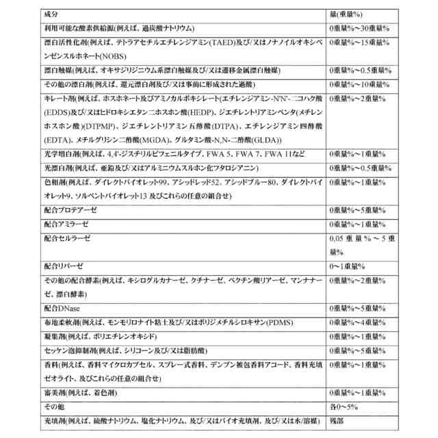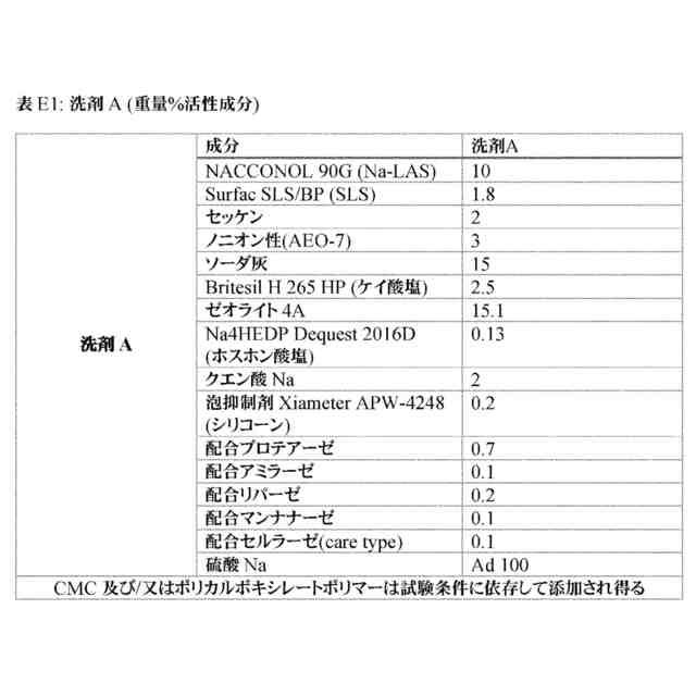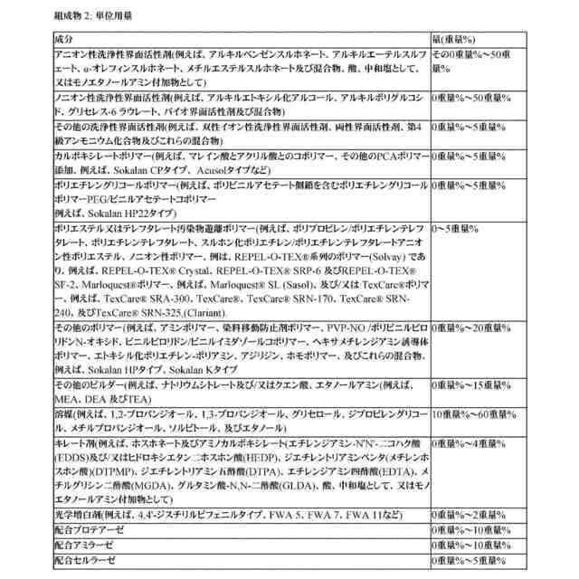 再付着防止ポリマー:本発明に関連して、ポリマーとしては、限定されないが、ポリアクリル酸、修飾ポリアクリル酸ポリマー、修飾ポリアクリル酸コポリマー、マレイン酸-アクリル酸コポリマー、カルボキシメチルセルロース、セルロースガム、メチルセルロース、及び/又はこれらの組合せが挙げられる。