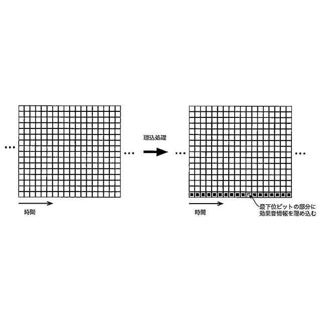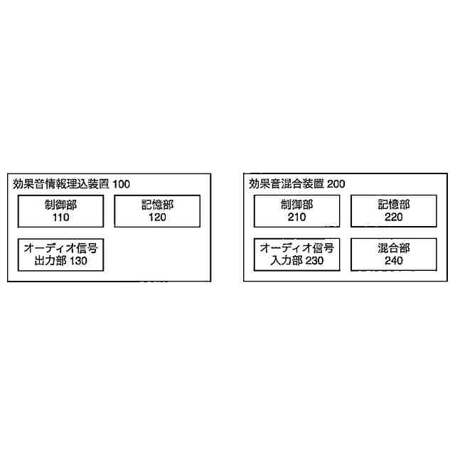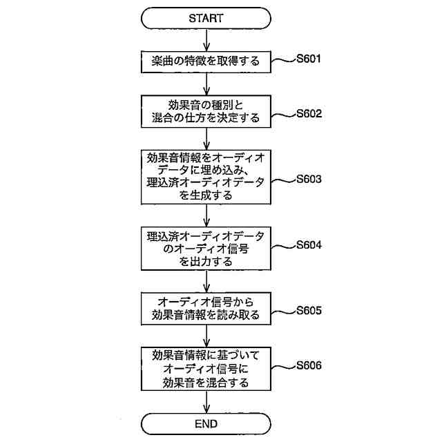 請求項2に記載の発明は、楽曲に混合する効果音の種別と当該効果音の混合の仕方を示す効果音情報を前記楽曲のオーディオデータに埋め込むことで生成された埋込済オーディオデータから前記効果音情報を読み取る効果音情報読取部と、効果音のオーディオデータを記憶部と、前記読み取られた効果音情報に基づいて、前記埋込済オーディオデータに、効果音のオーディオデータを混合する混合部と、を有する。