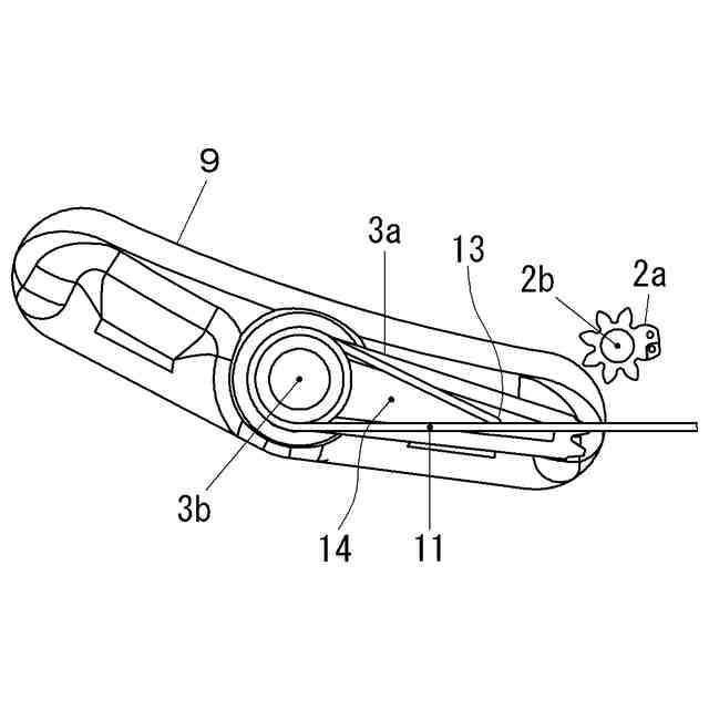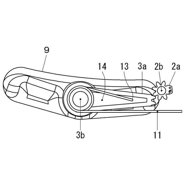 特許文献2の車両進入報知器の二つの車輪の内、レバーによって上方に配置されている車輪に、車両の車輪が接触すると、車両進入報知器の車輪が回転すると共にレバーが揺動し、上方に上げられていたレバーの一端が台座方向へと押し込まれ、軸が回転してその回転がスイッチ発電機構に伝達される。軸の回転により、スイッチ発電機構のスプリングの収縮や歯車の回転が発生し、次にモータのシャフトが回転し、シャフトの回転に伴いモータ内部のコイル又はマグネットの一方が可動して、電磁誘導によりモータ内部で電力が自己発電される。その電力により無線機等が稼働されて信号が発信され、車両の進入又は通過が報知される。
