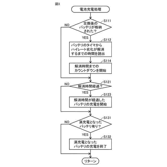 【解決手段】バッテリは、電動車両の駆動用の交換可能なバッテリである。バッテリが電動車両から外された後に充電装置に接続されてから特定時間(たとえば、解消時間、一定時間)が経過するまでは当該バッテリの充電を開始させない(ステップS111からステップS123)。これにより、バッテリが電動車両から外された後に充電装置に接続された場合であっても、特定時間が経過するまでは当該バッテリの充電が開始されない。特定時間は、電動車両に接続されているときの所定電流値を超える充放電を含む充放電によるバッテリの電解液のリチウムイオンの濃度分布の偏りに起因したバッテリの内部抵抗が上昇した状態であるハイレート劣化が解消するまでの時間であるようにしてもよい。