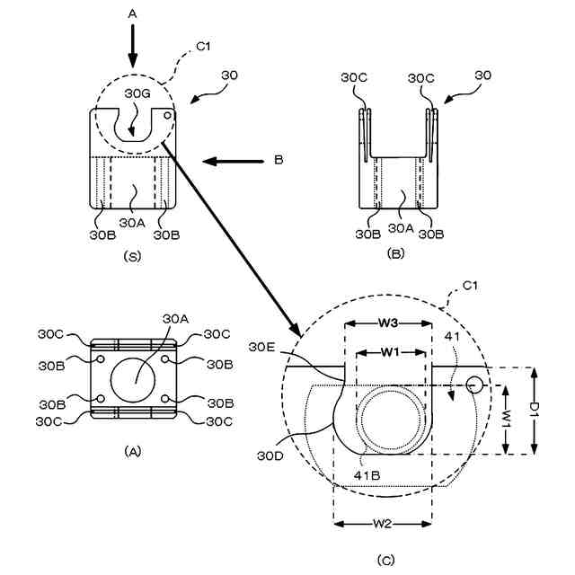 正面視の上端部に開放し、前記吸着部の揺動範囲を規制する揺動規制部、及び前記揺動規制部の上端部に設けられ、前記吸着部を傾斜状態から起立状態に戻す起立規制部を有する揺動規制溝を備え、側面視の手前側から奥側に向かって切り欠かれ、前記揺動部を揺動可能に支持する揺動平面を形成する揺動受溝、及び前記揺動受溝と底面とを連通するガイド部揺動孔を有し、前記ベース部に前記ベース部揺動孔と前記ガイド部揺動孔が連通するように固定されるガイド部と、
