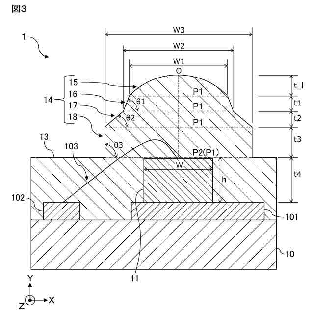 前記出射光調整部は、最上部のレンズ部、前記レンズ部と接続された第1テーパー部、前記第1テーパー部と接続された第2テーパー部、前記第2テーパー部及び前記基部と接続された第3テーパー部を有し、