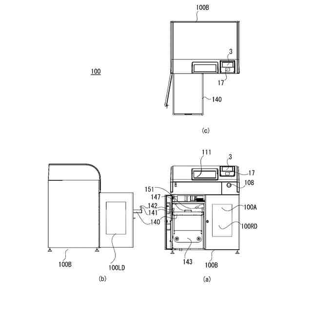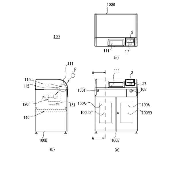 詳細には、図1~3に示したように、本発明の実施形態に係るペットボトル回収装置100は、装置の本体部100Bの上部に容器投入部110が設けられており、容器投入部110の開口部の外側には外扉111が設けられている。装置の本体部100Bは、外扉111よりも上部付近の正面側に、表示操作部3、送受信部4(不図示)、リーダライタ17(カードリーダライタ)が設けられている。また、装置の本体部100Bの正面側には、荷物フック100fが設けられている。
