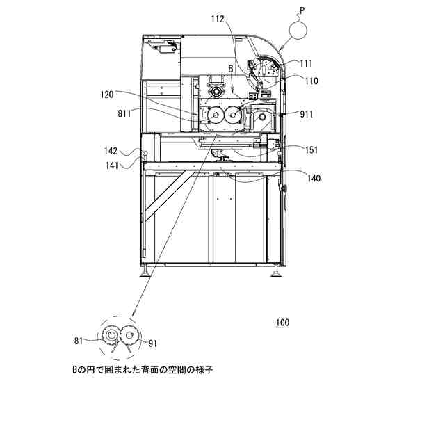 ペットボトル回収装置100は、待機時、物品投入部110の外扉111が閉状態であり、容器投入部110と袋保持部140の間に開閉自在に設けられた内扉112が閉状態である。袋保持部140は、空容器を回収するために用いられる袋(ビニール袋)を保持するものである。物品回収時に、容器投入部110の外扉111が開状態となり、判定部101(不図示)により、容器投入部110の載置部へ載置された物が回収対象である空のペットボトルであるか否かが判別される。空のペットボトルであると判別された場合、外扉111が閉状態となり、容器投入部110と袋保持部140(本実施形態においては、袋保持部140は2つ備えられている。)の間に設けられた内扉112が開状態となり、袋保持部140に保持された袋にペットボトルが回収される。本実施形態では、ペットボトル回収装置が減容機構(減容部120又は容器減容部ともいう)を備え、減容機構(減容部120)によりペットボトルを減容することで、規定容量の2つの袋(ビニール袋)によって多量の減容されたペットボトルを回収可能である。また、振分け手段151によって、ペットボトルの送出方向を前後左右の様々な方向に異ならせることができ、さらには、複数の収容部(袋保持部140)の境を覆う山型形状突状部160により、ペットボトルを確実に左右の収容部に送り出すことができるため、回収効率の良い袋交換が可能である。