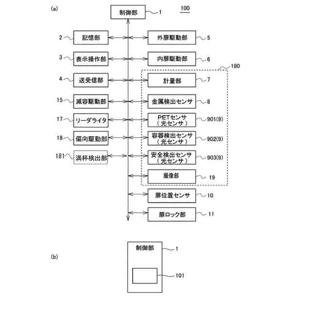 ペットボトル回収装置を説明するための図であり、(a)はペットボトル回収装置の電気的な機能ブロック図、(b)は制御部の機能ブロック図である。