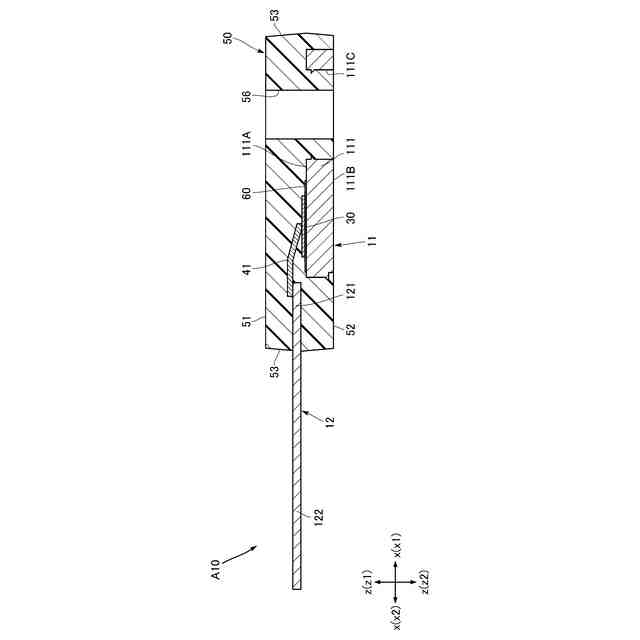 前記基材層は、前記第1方向の第2側z2を向き且つ少なくとも一部が前記第1リードと接合された第2面を有し、