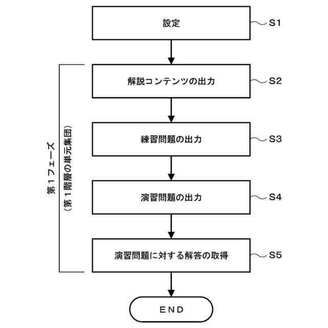 第1フェーズにおいて、第1階層の単元集団に含まれる学習単元に関する解説コンテンツを出力する処理、並びに、前記第1階層の単元集団に含まれる前記学習単元に関する練習問題及び演習問題を出力する処理、