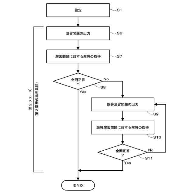 前記第2フェーズにおいて、前記第2階層の単元集団に含まれる学習単元に関して出力した前記演習問題に対するユーザの解答を取得し、取得した前記ユーザの解答が誤りである前記演習問題を、取得した前記ユーザの解答が正解になるまで繰り返し出力する、