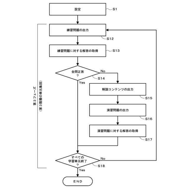 前記第3フェーズにおいて、前記第3階層の単元集団に含まれる学習単元に関して出力した前記練習問題に対するユーザの解答を取得し、取得した前記ユーザの解答が誤りである前記練習問題に対応する学習単元に関する前記解説コンテンツの出力と、取得した前記ユーザの解答が誤りである前記練習問題に対応する前記学習単元に関して前記第1フェーズにおいて出力した前記演習問題の出力とを、取得した前記ユーザの解答が正解になるまで繰り返す、