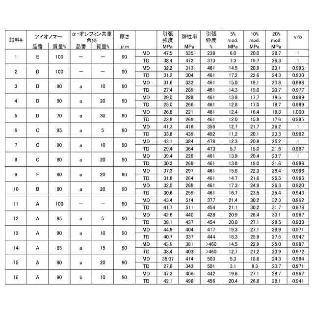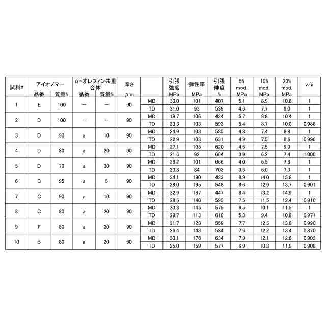 また、特許文献5には、アイオノマーを用いるものではないが、プロピレンとエチレン及び/又は炭素数4~8のα-オレフィンとのランダム共重合体を主成分とする均一拡張性フィルムが記載されている。そして、実施例において、引張試験で降伏点が見られたものは、フィルムを拡張する際にネッキングが起こるため、均一に拡張することができず、また、フィルムが塑性変形しているため、拡張後に張力を取り除いてもフィルムが元の形状に戻らないとの記載がある。