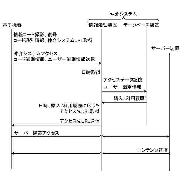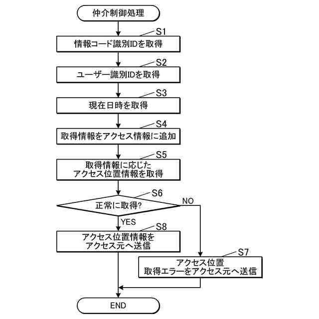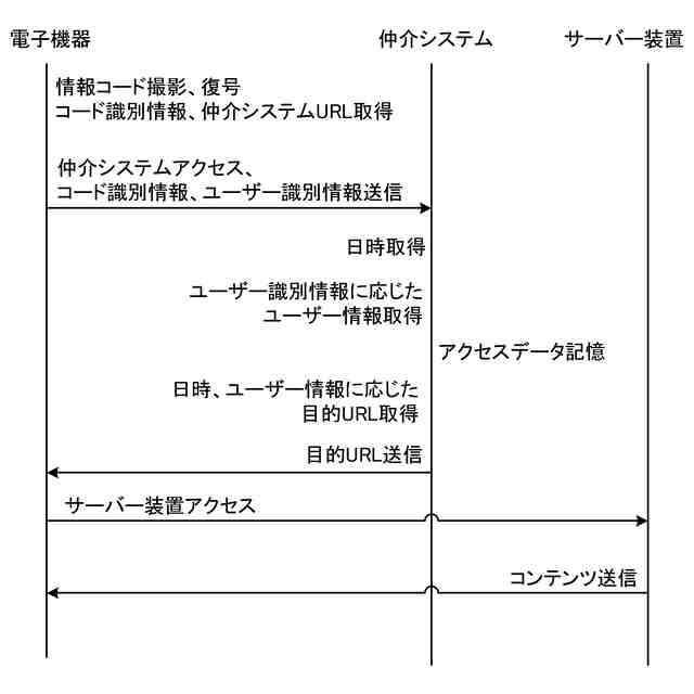 このとき、情報コードが直接最終的なアクセス先の位置情報ではなく、仲介サーバーの位置情報を含んでいる場合がある。情報コードに基づいて電子機器が仲介サーバーにアクセスすると、仲介サーバーは、情報コードの識別情報などに基づいて最終的なアクセス先の位置情報を電子機器に送信する。電子機器は、この位置情報を受けて、最終的な情報サイトにアクセスする。仲介サーバーは、上記識別情報や電子機器のアクセス情報を取得して、これらを情報コードの利用状況の解析などに用いることができる(特許文献1)。