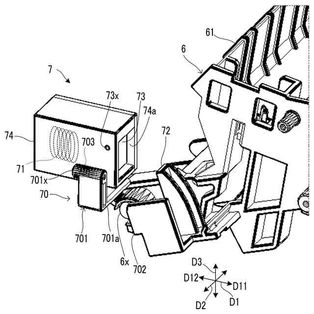 【解決手段】転写部材433は、可動ユニット6に支持される。遮断部材73は、第1端子71へのアクセス経路を遮断する遮断位置と前記アクセス経路を開放する開放位置との間で移動可能である。第2端子72は、可動ユニット6に支持される。係止機構70は、前記可動ユニット6の移動に連動し、前記可動ユニット6が離隔位置に位置するときに前記遮断部材73を前記遮断位置に係止し、前記可動ユニット6が前記離隔位置から基準位置へ移動するときに前記遮断部材73の係止を解除する。前記可動ユニット6が前記離隔位置から前記基準位置へ移動するときに、第2端子72は、前記アクセス経路を経由して前記第1端子71と接触する位置へ移動する。