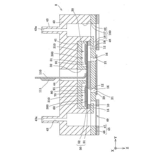 前記流路構造体は、前記第1開口の少なくとも一部および前記第1部分の一部を画定する第1基板と、前記第1基板に積層されることで前記第1部分の一部を画定する第2基板と、を含む、