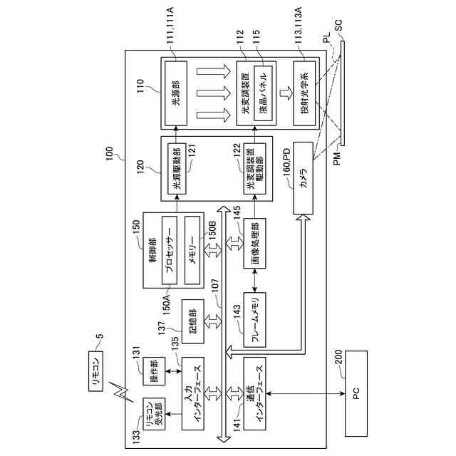 投射部110は、光学的な画像の形成を行い、投射画像PMに対応する画像光PLをスクリーンSCに投射する。また、投射部110は、スクリーンSC上に投射画像PMを表示するように、画像光PLを投射する。