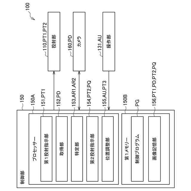 本開示の更に別の一態様は、第1パターン画像を投射面に投射して表示することと、カメラに前記第1パターン画像を撮像させることによって、撮像画像を取得することと、前記撮像画像に基づいて、前記第1パターン画像のうち正常に検出されない領域である第1領域を特定することと、前記第1領域を、前記第1パターン画像のうち前記第1領域以外の領域である第2領域と識別できるように、前記第1パターン画像が処理された第2パターン画像を、前記投射面に投射して表示することと、を実行する、プロジェクターである。