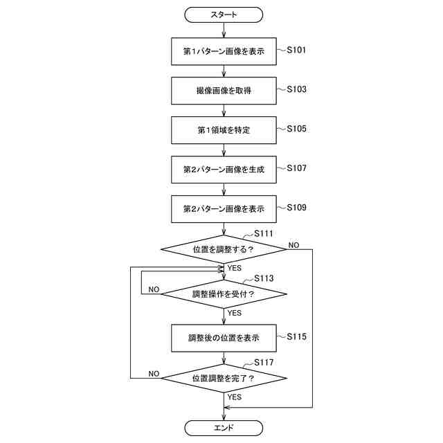 前記第1領域における前記第1パターン画像の部分の位置をユーザーからの操作に基づいて調整することを示す回答を前記表示装置から受け付けた場合に、ユーザーの操作に応じて前記調整点の位置を調整することと、