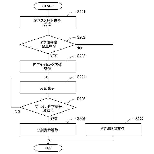 前記ドアの閉制御が禁止されているときに前記ドライバによって前記閉ボタンが押下された場合、前記閉ボタンが押下されたタイミングで前記車内カメラによって撮像された画像を、前記車内カメラによって撮像されたリアルタイムの車内の画像と共に、前記ディスプレイに所定の期間分割表示する。