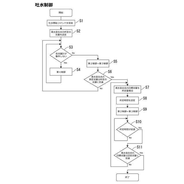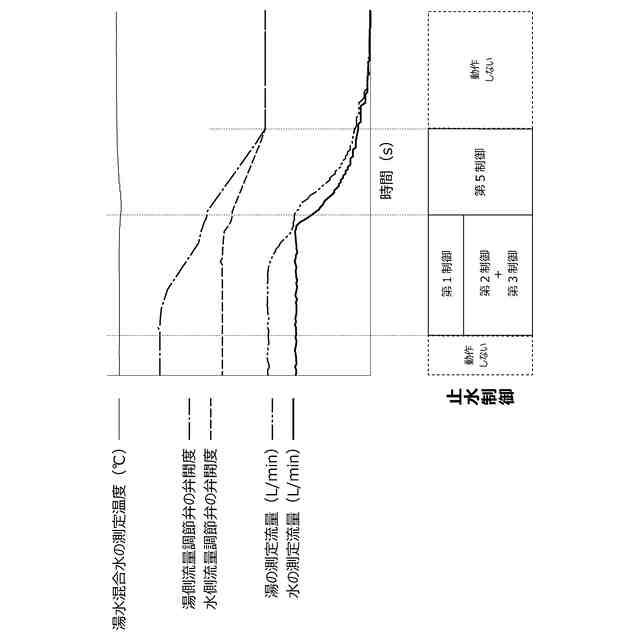 湯水混合水の所定の流量と前記設定流量との間において、流量を複数段階に分けて変化させ、段階ごとに分けた際の湯水混合水の流量を湯水混合水の目標流量に設定する第1制御と、