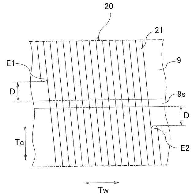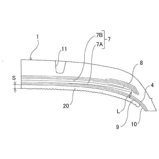 本発明者は、シーラント層のタイヤ内面に対する接着性について鋭意研究を行った結果、シーラント帯材の端部がブラダー転写模様に含まれる突条と重複する位置に配置されていると、悪路走行等においてシーラント帯材の端部が剥離し易くなることを知見し、本発明に至ったのである。