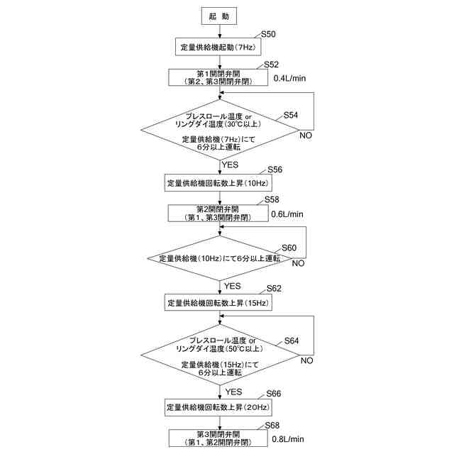 その後、再造粒装置を起動させて木質バイオマスを再造粒装置へ導入する。再造粒装置は、定格運転に移行する過程において、プレスロールやリングダイの温度が徐々に上昇し、再造粒装置に投入される木質バイオマス(木屑)の量も徐々に増えてくるので、成形されるペレットの品質を維持するためには、プレスロールやリングダイの温度帯に応じて、又は、木屑を供給する定量供給機の回転数に応じて、木屑と混合させる加水量を段階的に増加させる必要がある。