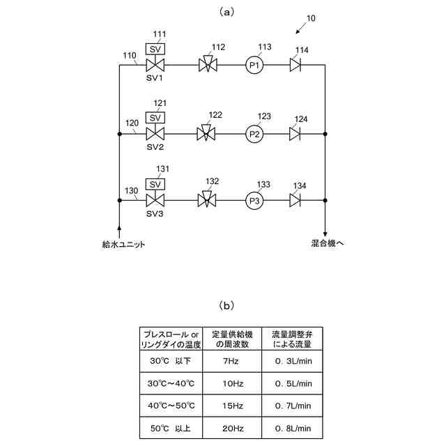 そこで、使用する分岐経路を選択した上で、再造粒装置に導入する木質バイオマスと混合させる給水量を調整するために、図5(b)に示されるように、プレスロールやリングダイの温度帯に応じて、又は、木屑を供給する定量供給機の回転数(定量供給機の周波数)に応じて、流量調整弁112,122,132の開度を手動制御し、給水量をフローメータを見ながら予め試運転で決定された最適値(表に示される値)となるように調整することも可能となる。