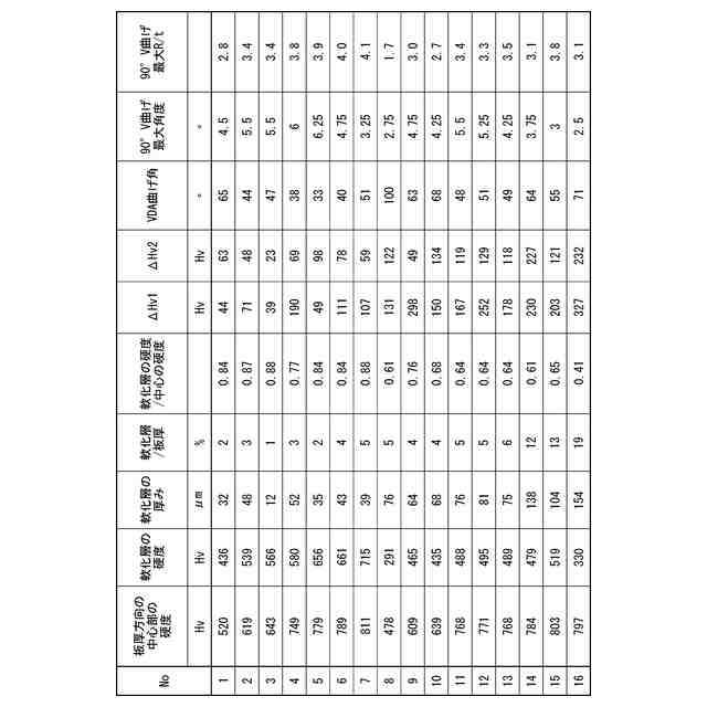 [12] 上記[1]~[11]のいずれかに記載の成形体の曲げ性の評価方法では、上記成形体は、表面から板厚方向に軟化層が設けられ、上記軟化層が設けられた部分における板厚方向の中心部の硬度は400Hv以上であり、上記軟化層は、上記軟化層が設けられた部分における上記板厚方向の中心部の硬度よりも少なくとも10Hv以上低い硬度を有する領域であり、上記軟化層の厚さは、上記軟化層が設けられた部分における上記板厚の2%以上20%未満であり、上記表面における上記軟化層の硬度が、上記軟化層が設けられた部分における上記板厚方向の中心部の硬度の0.5倍以上0.9倍未満であり、上記軟化層は、上記板厚方向において、上記表面から上記軟化層の厚さの40%までの領域である第一の硬さ変化領域と、上記軟化層のうち上記第一の硬さ変化領域ではない領域である第二の硬さ変化領域とを有し、上記第一の硬さ変化領域における板厚方向の硬さ変化の絶対値ΔHv1は、上記第二の硬さ変化領域における板厚方向の硬さ変化の絶対値ΔHv2よりも大きい鋼板が成形された成形体であってもよい。