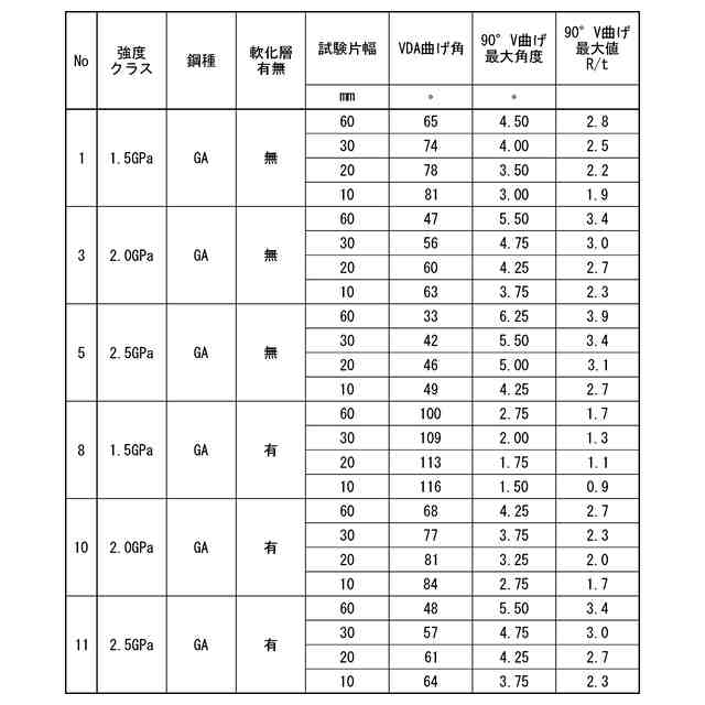 実施例の90°V曲げ試験における板厚tに対するV型パンチの先端の曲率半径Rの比R/tとVDA最大曲げ角との関係を試験片幅ごとにプロットしたグラフである。