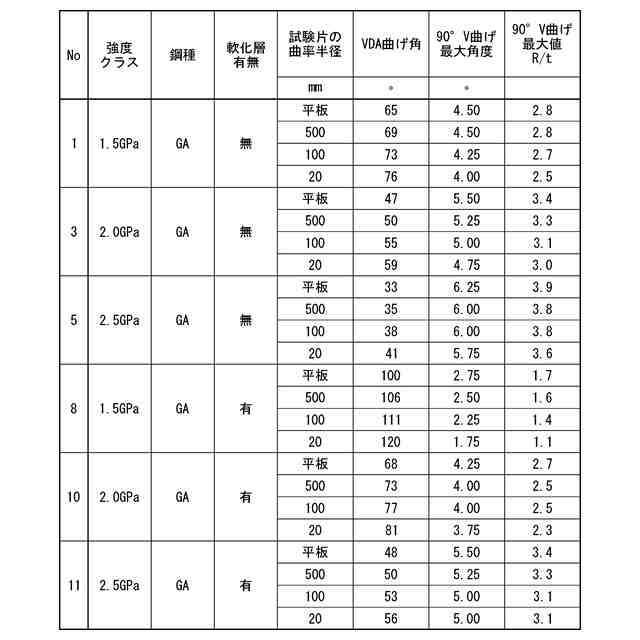 実施例の90°V曲げ試験における板厚tに対するV型パンチの先端の曲率半径Rの比R/tとVDA最大曲げ角との関係を試験片の曲率半径ごとにプロットしたグラフである。