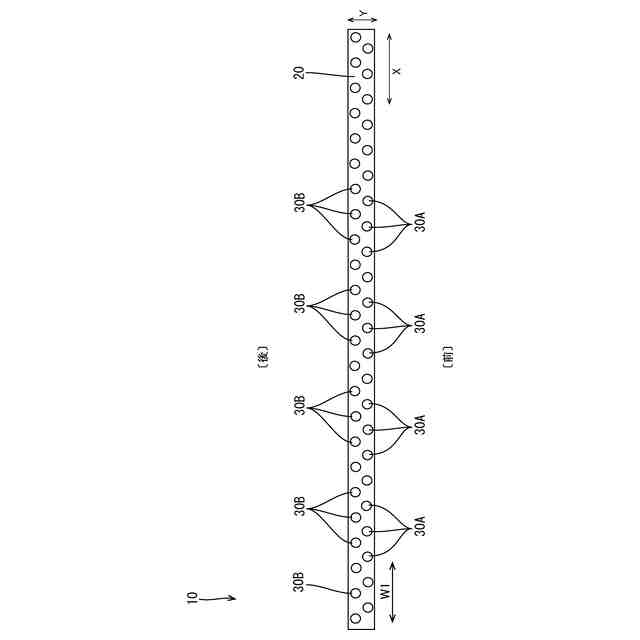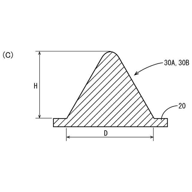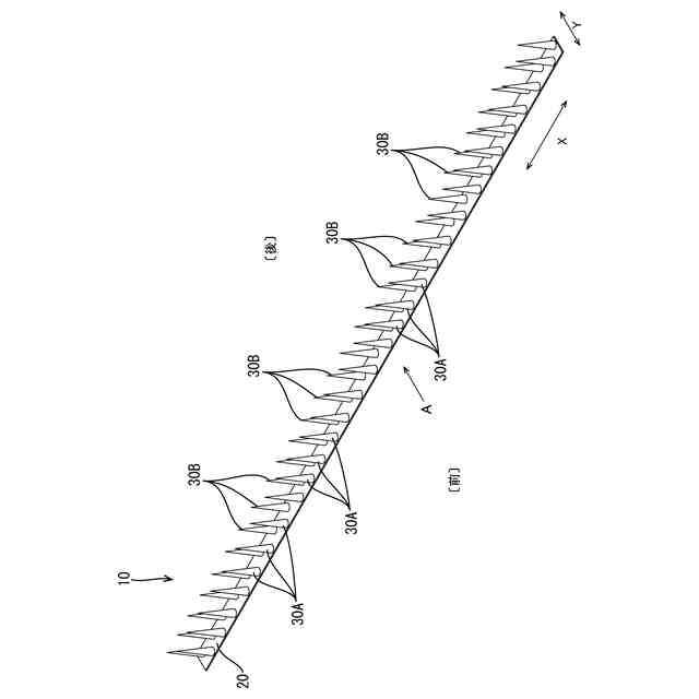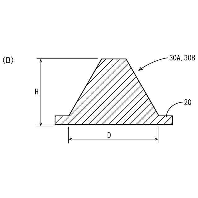 突起30A、30Bは、図5(A)に示すように円錐形状(断面が三角形)であり、ベース20上に点在している。この例では、ベース20の前側に突起30Aが一定の間隔で配置され、後側に突起30Bが一定の間隔で配置されている。前後の突起30A、30Bは同じ形状である。