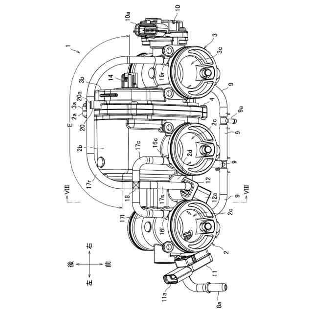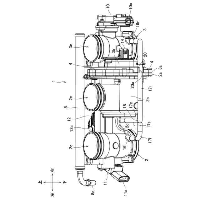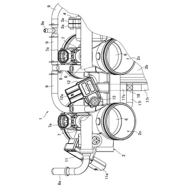 【解決手段】スロットルボア2c,3c内でスロットル軸5によりスロットル弁6が開閉可能に支持された主スロットルボディ2及び副スロットルボディ3と、一端が副スロットルボディ3のスロットルボア3cに接続された右圧力検出用ホース17rと、副スロットルボディ3に一体形成されて右圧力検出用ホース17rの中間箇所を固定するホース保持部20とを備えた。