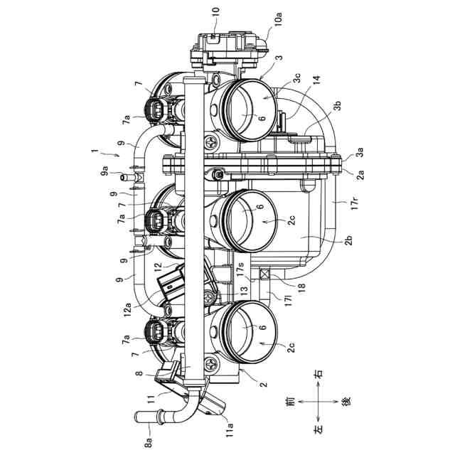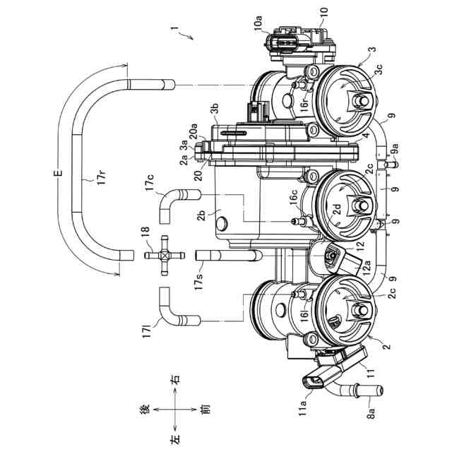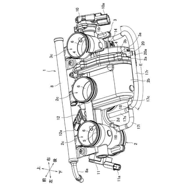各スロットルボアには、種々の用途のホースが接続されている。例えばエンジンの燃料噴射制御のために吸気圧に関する情報を必要とする場合には、各スロットルボアの圧力取出し用ニップルに圧力検出用ホースの一端が接続され、各ホースは互いに集合して他端が共通の吸気圧センサに接続される。各スロットルボア内を流通する吸気の圧力は圧力検出用ホースを介して吸気圧センサに伝達されて吸気圧として検出される。