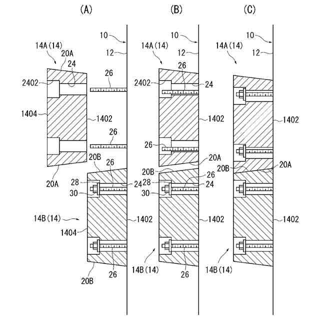 図3(C)に示すように、複数の水中音響材14が取り付けられる船体などの水中構造体10の被取り付け面12は、平面または凹状の曲面または凸状の曲面で構成されている。