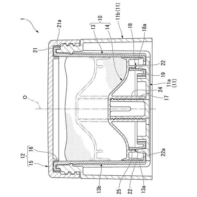 新たなリフィル容器が容器本体の内側に収容されたときには、容器本体の解除突起によって、中筒係止壁が、中皿係止壁から径方向に離れる向きに押圧されて変形することで、中筒係止壁による中皿係止壁の係止が解除される。したがって、新たなリフィル容器を容器本体内に収容したときには、中皿ねじ筒および容器ねじ筒の周方向の相対回転に伴い、中皿を中筒および容器本体に対して上昇させることが可能な状態にすることができる。