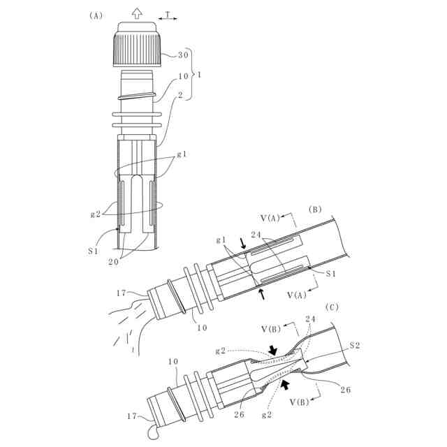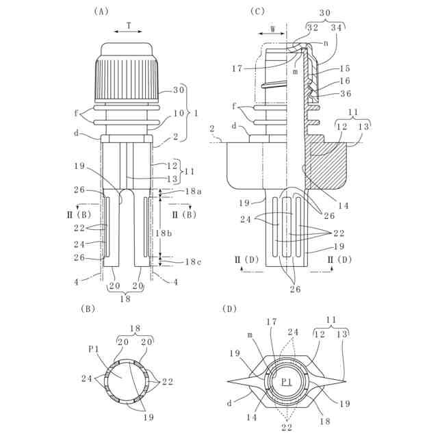 これら一対の脚部20は、前記袋体2の外側から前記厚み方向Tの内側へ押し込む操作により、前記一対の脚部20の間に大面積通路P1が画成される第1位置S1から、前記一対の脚部20の間に小面積通路P2が画成される第2位置S2へ変位することが可能に構成した。