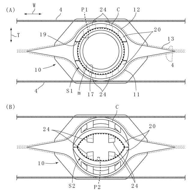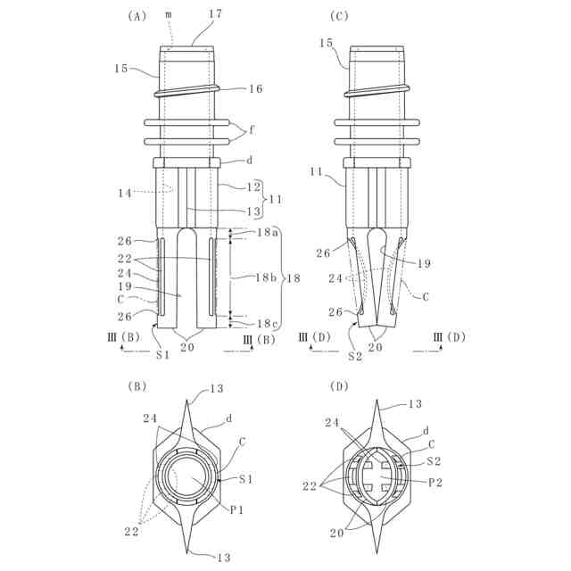 本手段では、図2(B)に示す如く、一対の脚部20は、貫通孔14の周囲から垂設される脚筒18に一対の切割り19を穿設することにより、下方から見て弧状の形態に形成された。