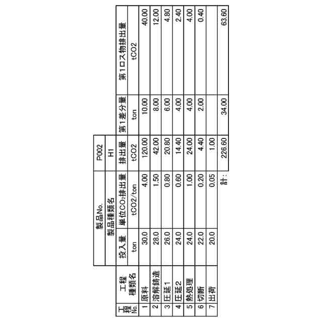 排出量に、当該製品の当該工程の投入量に対する当該製品の当該工程の第1差分量の割合を乗算することによって、当該製品の当該工程の第1ロス物排出量を求める。好ましくは、上述の二酸化炭素排出量演算システムにおいて、前記第1排出量演算部は、工程の実施で生じるCO