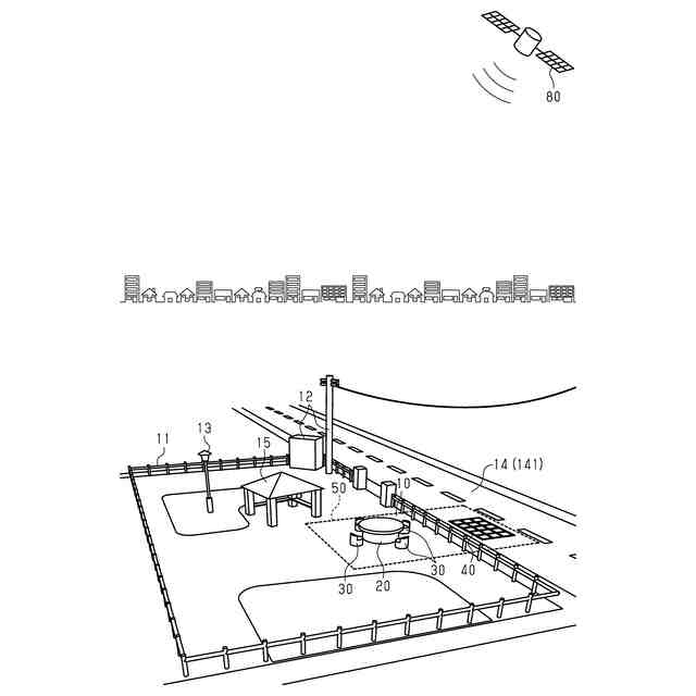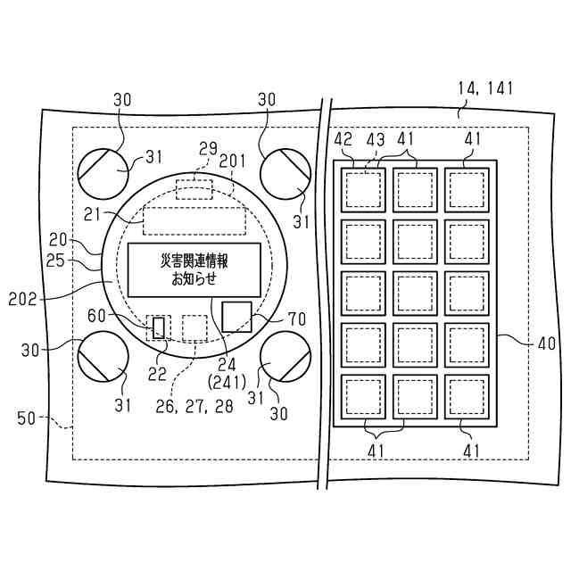 図1に示すように、災害時支援装置10は、避難場所11と避難場所11に隣接する場所に構築される。例えば、避難場所11は、公園、学校、空地、及び駐車場等である。避難場所11には、商用電源設備12、野外照明13、及び東屋15が設置されている。避難場所11は、舗装路14と隣接している。例えば、舗装路14は、車道である。商用電源設備12は、避難場所11とは異なる場所に設置された発電所からの電力を供給する。例えば、野外照明13は、商用電源により点灯する。災害時支援装置10は、テーブル20と、イス30と、太陽光発電装置40と、耐震性を有する地下構造体50と、を備える。テーブル20及びイス30は、野外家具の一例である。