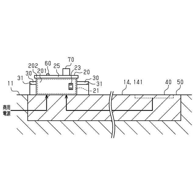 テーブル20は、蓄電装置21を内蔵している。蓄電装置21は、商用電源設備12と電気的に接続されている。蓄電装置21は、商用電源から充電可能に構成されている。蓄電装置21は、太陽光発電装置40と電気的に接続されている。蓄電装置21は、太陽光発電装置40から充電可能に構成されている。蓄電装置21と太陽光発電装置40の接続線は、地下構造体50に埋没している。