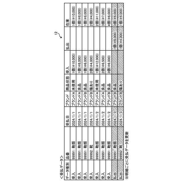 商品の種類を示す商品分類及び時間と共に変化する商品の態様である商品状態を諸口受払単位として、同じ前記商品分類及び同じ商品状態の商品毎の受入数及び売上数に対応する在庫数を含む受払データを生成する受払データ生成部と、